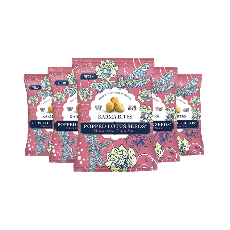 Karma Bites Himalayan Pink Salt Popped Lotus Seeds are a wholesome, plant-based snack made from the seeds of the Euryale ferox flower, also known as water lily. The seeds are popped in a similar way to popcorn, creating a light, crunchy texture with a subtle nutty flavour.