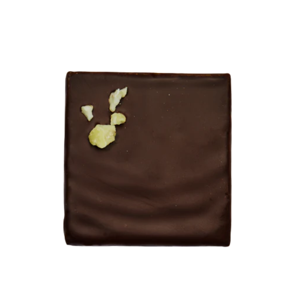 Hand crafted organic dark chocolate squares filled with silky pistachio nut butter