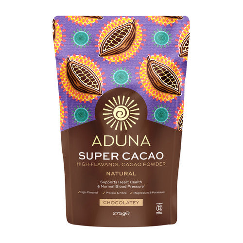 Aduna Super-Cacao is a nutrient-rich, single-origin cacao powder with one of the highest flavanol contents available. Flavanols are scientifically proven to support healthy blood flow and circulation. This premium organic cacao is carefully processed to retain its powerful nutrients while delivering a rich, smooth chocolatey taste perfect for both sweet and savoury recipes.