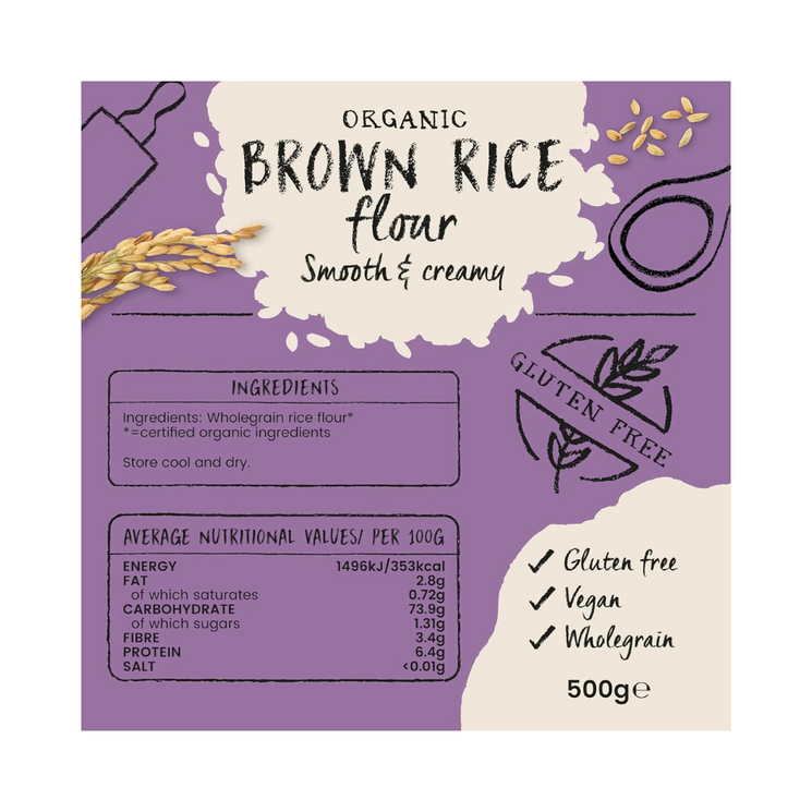 This fine brown rice flour is made by carefully milling whole organic rice grains to a very fine texture. Naturally gluten-free and versatile, it’s ideal for all your baking needs from pancakes and cookies to sauces and gluten-free bread making. Light, mild and easy to work with, it delivers clean, natural goodness with every spoonful.