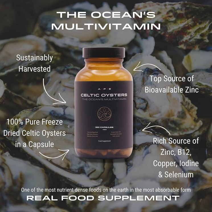 Ape Nutrition Celtic Oysters offer one of nature’s most nutrient-dense wholefoods in an easy capsule form. Often called the ocean’s multivitamin, oysters provide a wealth of minerals that support energy, hormonal balance, fertility, brain health, and sexual function. Sourced sustainably and gently freeze-dried to protect the fragile nutrients, this is a simple way to give your body the minerals and essential fatty acids it needs to thrive.