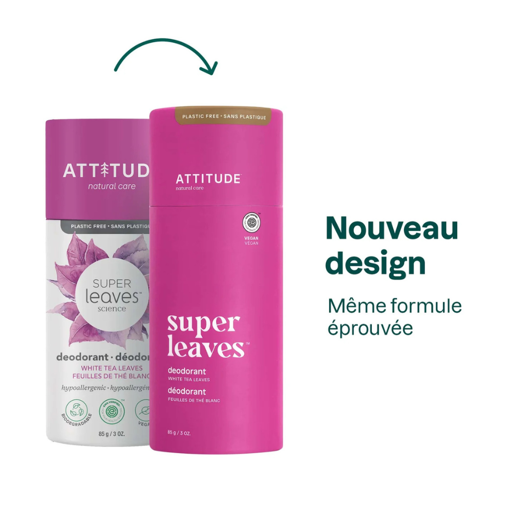 The Attitude Super Leaves™ White Tea Leaves Deodorant combines clean, natural performance with luxurious care for your skin. Formulated with baking soda to neutralise odour and arrowroot powder and corn starch to absorb moisture, it keeps you fresh and dry throughout the day. The gentle addition of white tea leaf extract helps maintain soft, supple skin while offering antioxidant benefits.