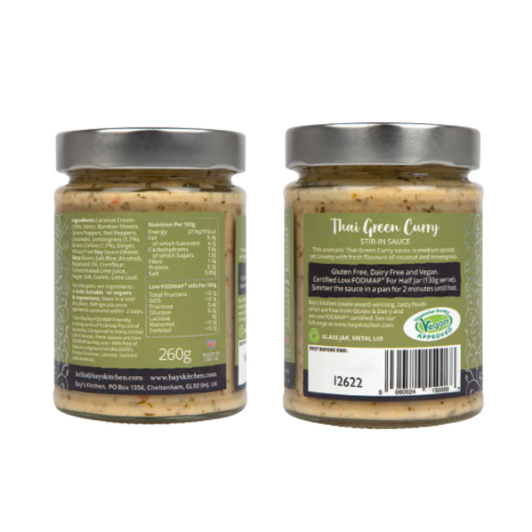 Bay's Kitchen Thai Green Curry Stir-in Sauce brings the bright, fresh flavours of Thailand into your kitchen with clean, simple ingredients. Coconut cream delivers rich, creamy comfort while lemongrass, green chillies and fresh peppers provide an uplifting, aromatic kick. Low FODMAP certified and free from artificial additives, it’s the perfect way to enjoy Thai-style curry without compromising your dietary needs.