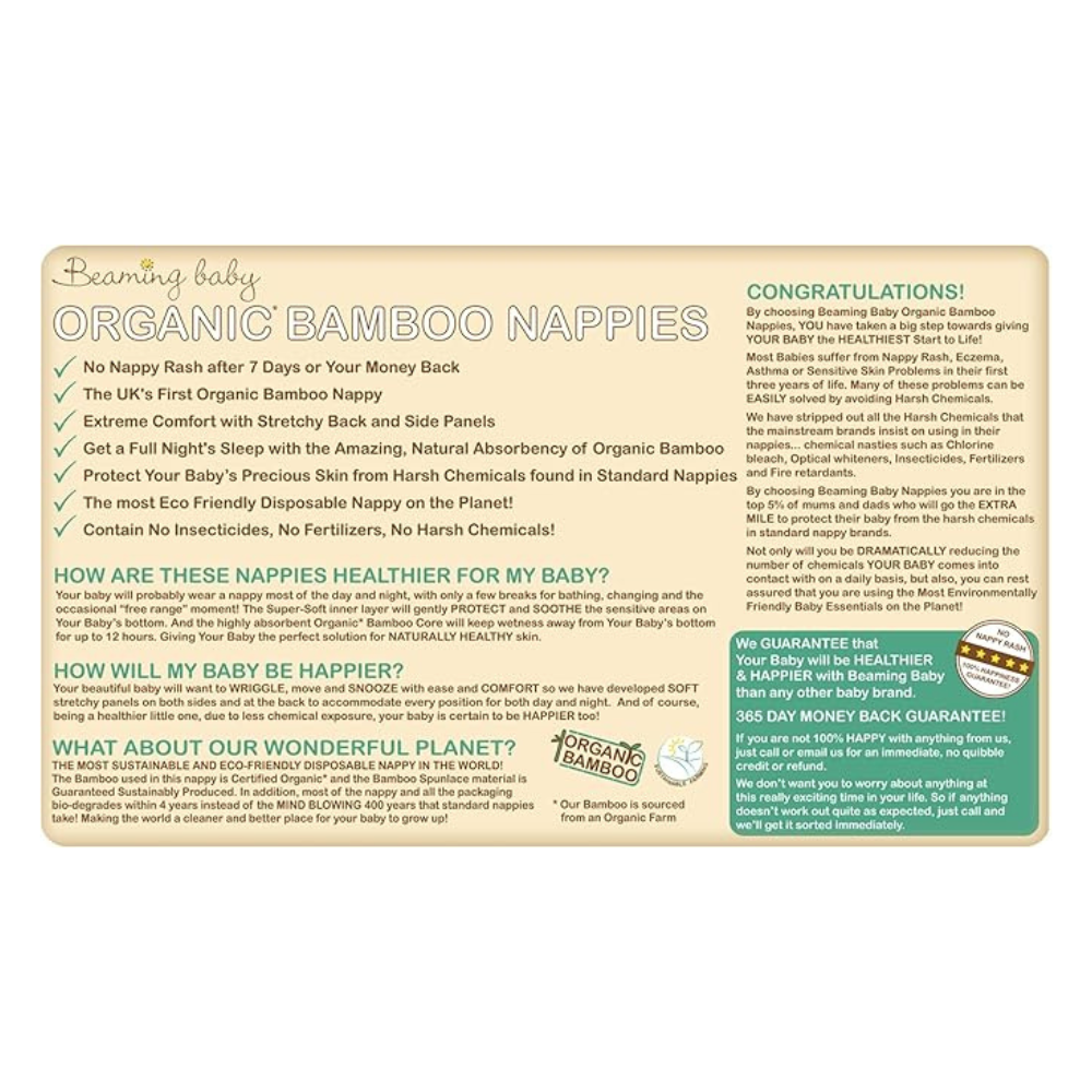Beaming Baby Organic Bamboo Nappies Size 2 combine gentle softness with outstanding absorbency for babies at a crucial growing stage. With carefully selected organic bamboo fibres, these nappies help prevent nappy rash and skin irritation while offering superior leak protection. Their biodegradable design ensures you’re caring for both your baby and the environment with every change.