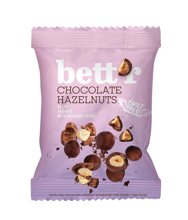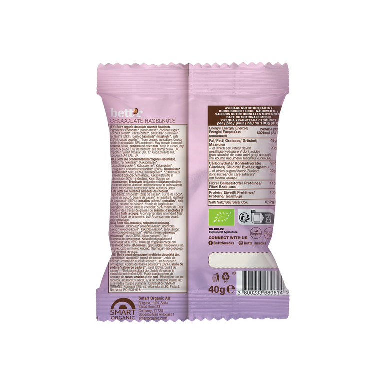 Bett’r Chocolate Covered Hazelnuts turn a simple combination of roasted hazelnuts and rich organic chocolate into a truly delightful treat. Sweetened with coconut sugar and crafted from whole food ingredients, this is snacking done the better way — clean, satisfying and delicious.