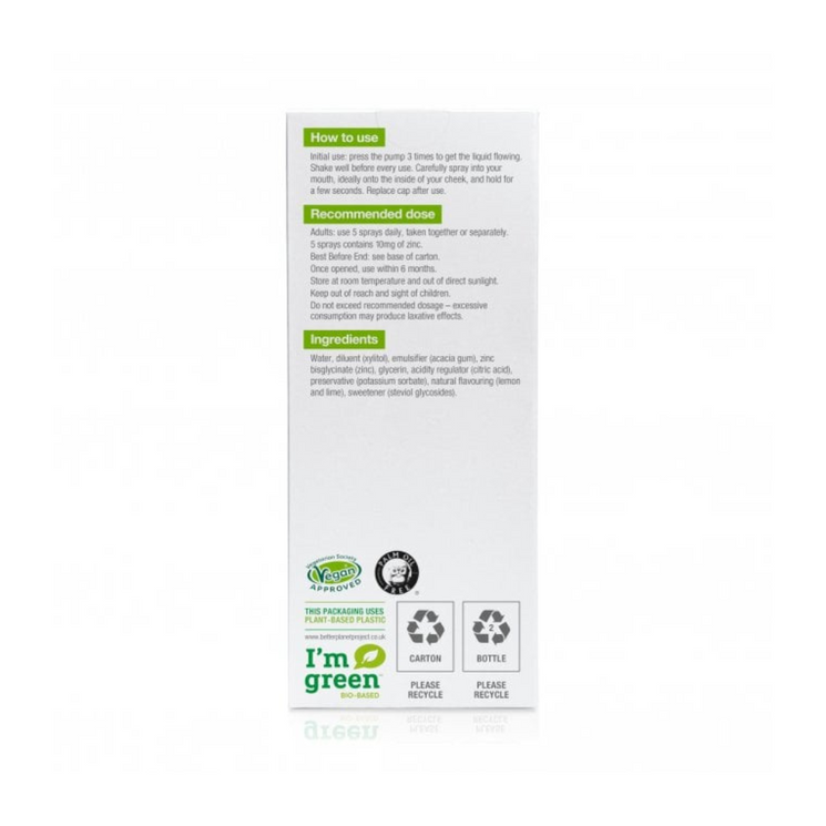 Water, Diluent (Xylitol), Emulsifier (Acacia Gum), Zinc Bisglycinate (Zinc), Glycerin, Acidity Regulator (Citric Acid), Preservative (Potassium Sorbate), Natural Flavouring (Lemon and Lime), Sweetener (Steviol Glycosides).