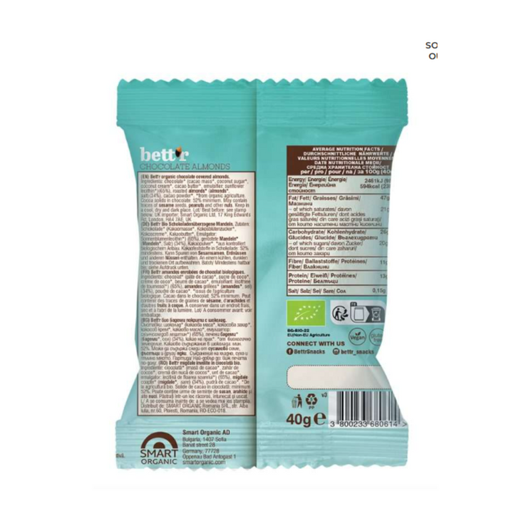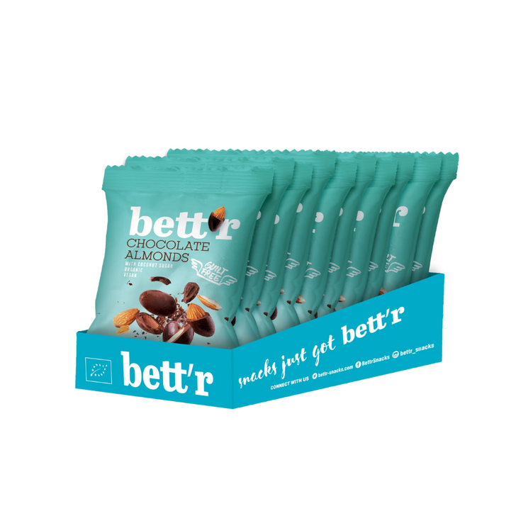 Bett’r Organic Chocolate Coated Almonds blend the nutty crunch of roasted almonds with smooth, rich cocoa for a delicious guilt-free snack. Simple, honest, and full of goodness a perfect little pick-me-up.
