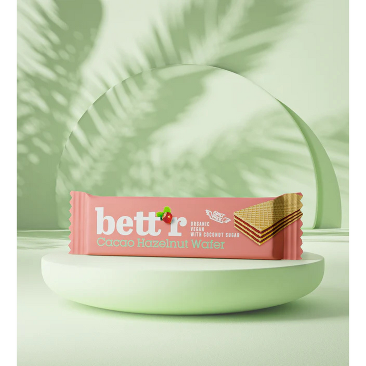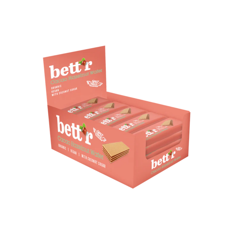 Bettr Organic Hazelnut Cacao Cream-Filled Wafer offers a delicious balance of crunch and creaminess with natural hazelnut and cacao flavours. Made with organic einkorn flour one of the oldest grains this wafer is a fibre-rich indulgence you can feel good about.