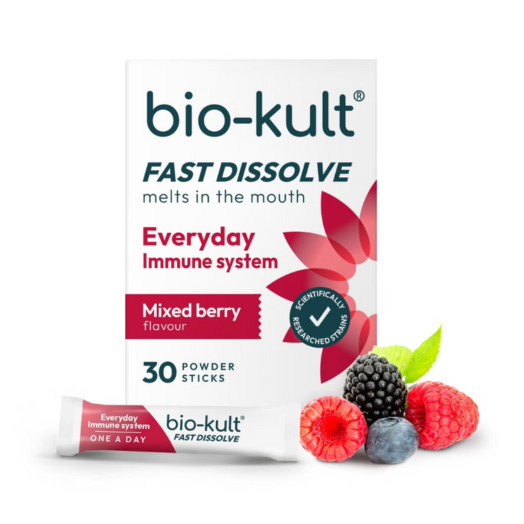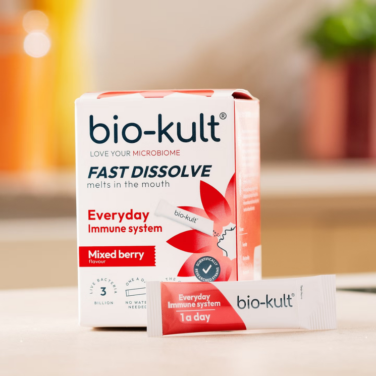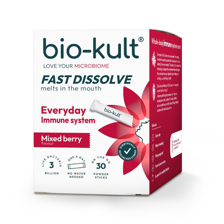 Bio-Kult Everyday Fast Dissolve Powder offers fuss-free daily support for your gut and immune system. Each mixed berry-flavoured sachet melts in the mouth no need for water making it ideal for kids, travel, or those who prefer not to swallow capsules. Formulated with Bifidobacterium animalis ssp. lactis and Lacticaseibacillus rhamnosus, alongside essential vitamins C and D3, it’s a simple and effective way to support your microbiome and everyday wellbeing.