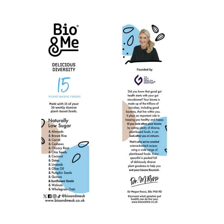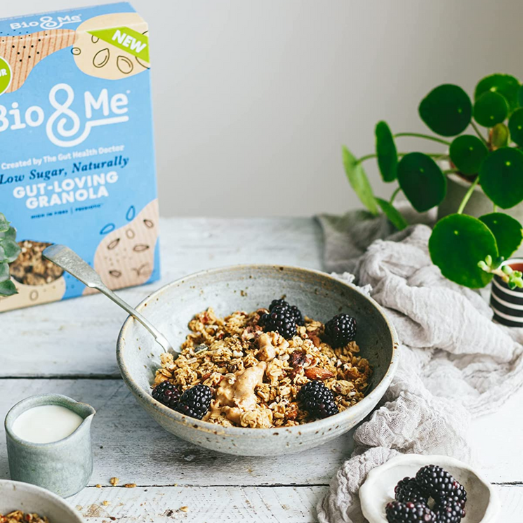 Bio&Me Low Sugar Natural Gut Loving Vegan Granola combines plant diversity with gut-friendly prebiotics in a gently sweet, crunchy blend. It’s a delicious way to start your day while supporting your gut health naturally.