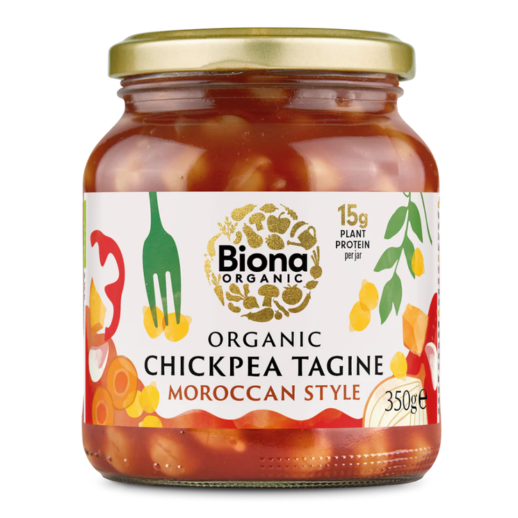 Biona Organic Chickpea Tagine Moroccan Style is a rich, warming stew made with organic chickpeas, juicy vegetables and a fragrant blend of traditional North African spices. Comforting yet vibrant, it delivers depth of flavour without heaviness, using simple, thoughtfully sourced ingredients. Perfect as a quick meal on busy days, this tagine can be enjoyed on its own, served with couscous or rice, or wrapped in warm flatbreads. Packed in a glass jar, it’s a convenient, pantry friendly option that feels wholesome and satisfying.
