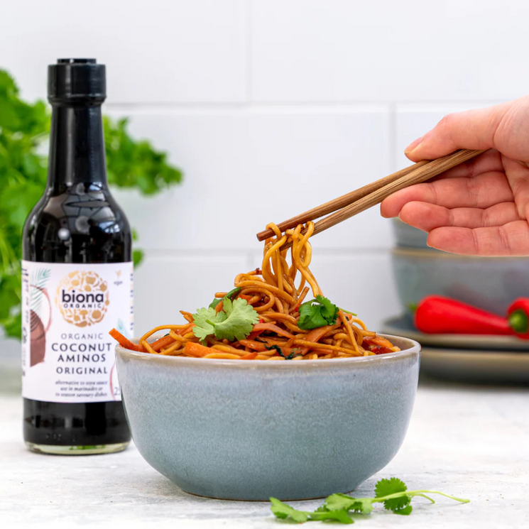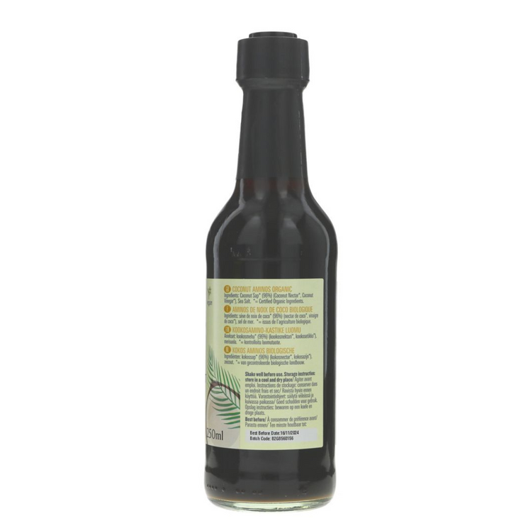 Biona Organic Coconut Aminos is a naturally fermented seasoning sauce made from the nectar and vinegar of organic coconut sap, combined with a touch of sea salt. With a naturally balanced sweet-savoury taste, it’s an excellent soy-free and gluten-free alternative to traditional soy sauce, perfect for those avoiding soy or wheat.