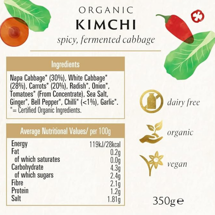 Organic Chinese cabbage* (27%), organic white cabbage*, organic carrots*, water, organic radish*, organic onions*, organic ginger*, organic red peppers*, organic chilli pepper* (<1%), organic garlic* (<1%), sea salt