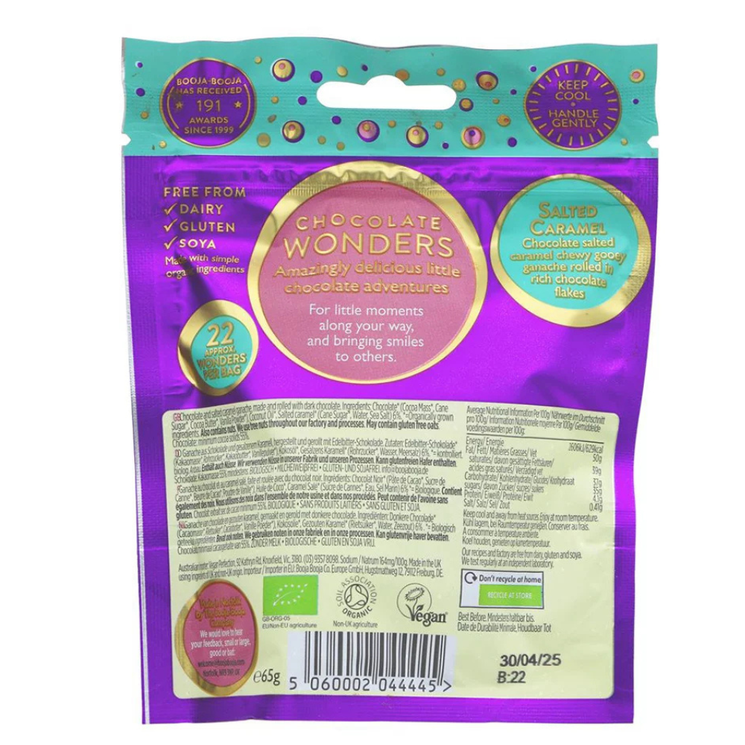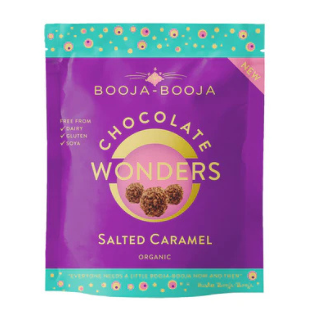 Booja-Booja Salted Caramel Chocolate Wonders are a delicious fusion of rich dark chocolate and smooth, gooey caramel the perfect balance of sweet and salty. Each truffle is crafted from organic ingredients and coated in fine chocolate flakes for a velvety finish that melts beautifully on the tongue.
