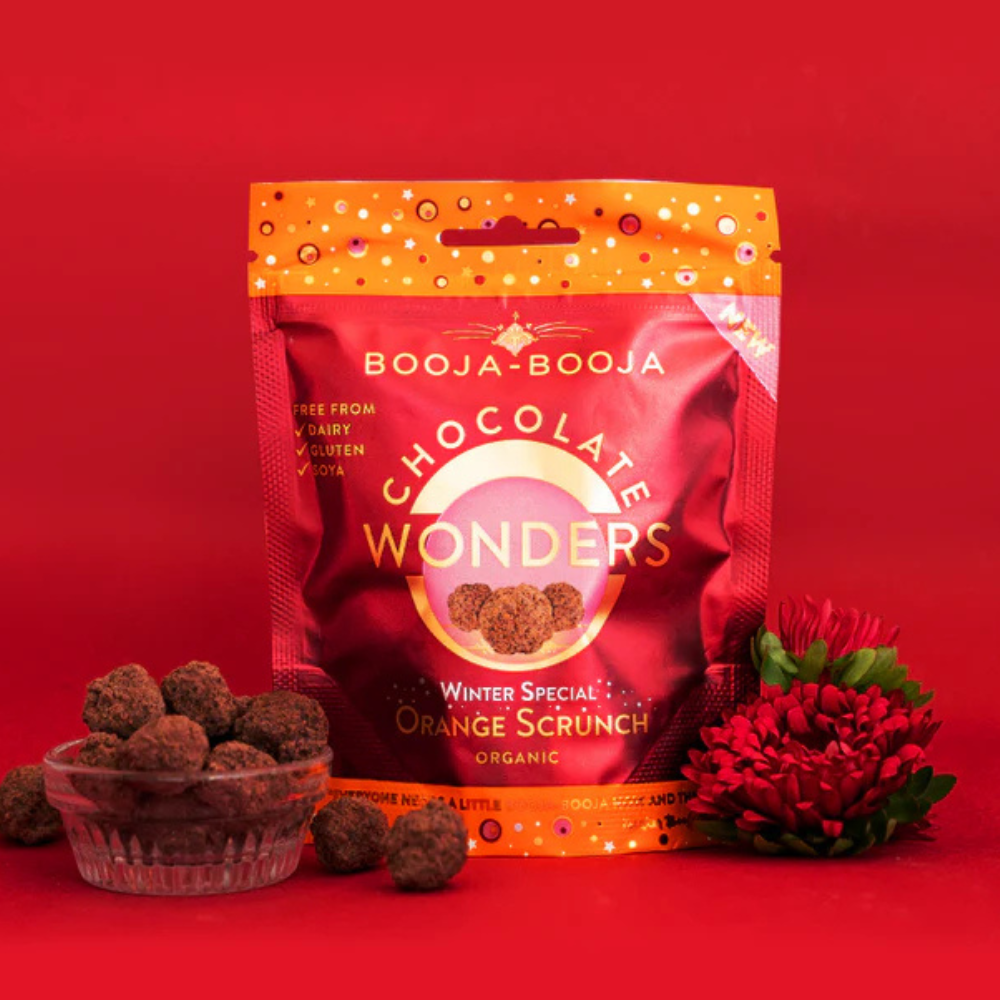 Booja-Booja Winter Special Orange Scrunch Chocolate Wonders are little bites of pure festive joy. Each piece features a smooth chocolate orange ganache, sprinkled with caramelised honeycomb scrunch, and rolled in rich dark chocolate flakes for an indulgent, melt in the mouth experience.