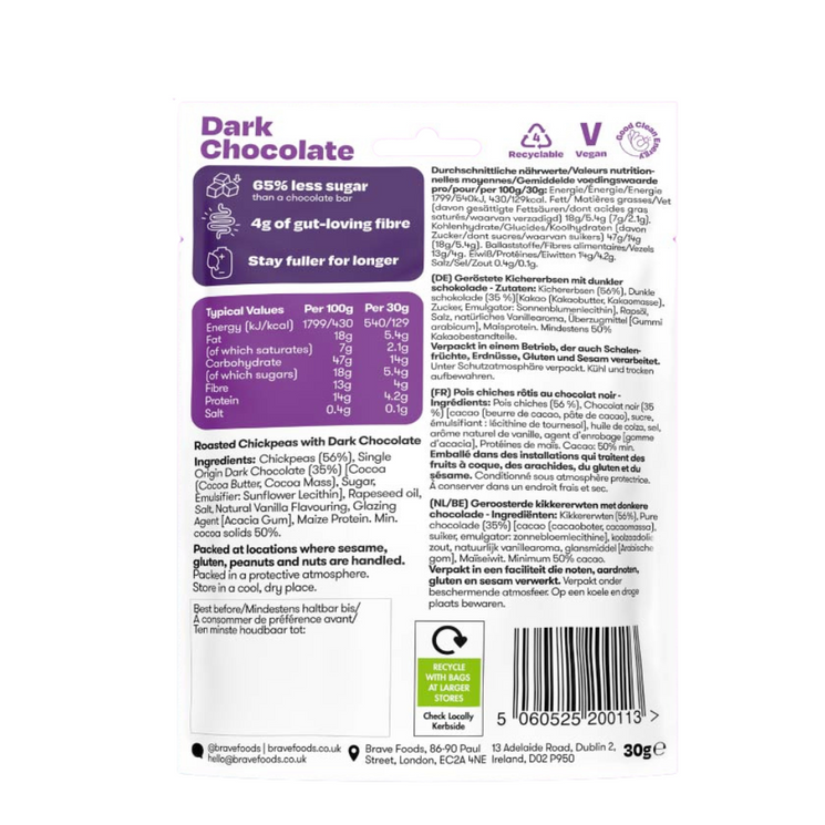 Brave have combined two favourite nutritious chickpeas and luxurious dark chocolate to create an irresistible snack that’s as good for you as it is delicious. With natural sweetness, a crunchy bite, and plenty of fibre and protein, this is a treat you can enjoy any time without compromise.
