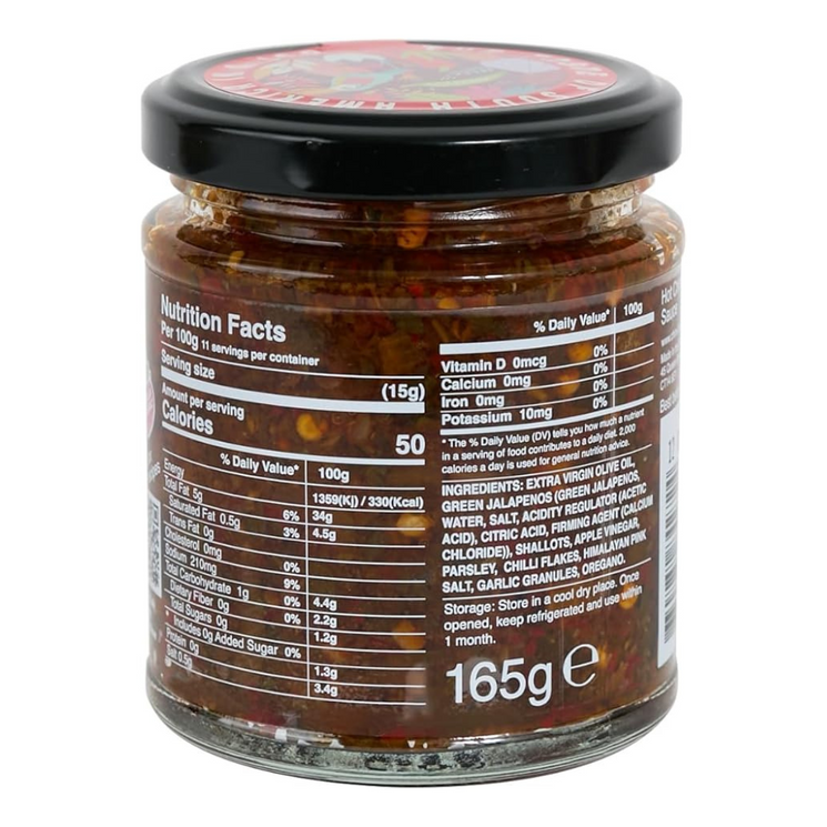 Extra Virgin Olive Oil, Green Jalapenos (Green Jalapenos, Water, Salt, Acidity Regulator (Acetic Acid), Firming Agent (Calcium Chloride)), Shallots, Apple Vinegar, Parsley, Himalayan Pink Salt, Garlic Granules, Chilli Flakes, Oregano.