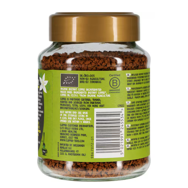 Clipper Organic Decaf Coffee delivers all the flavour of your favourite medium roast, minus the caffeine. Made from freeze-dried organic Arabica beans and finished with a touch of coffee oil for a more aromatic brew, it’s a deliciously smooth and ethical option for those cutting back on caffeine. A perfect pick for any time of day.