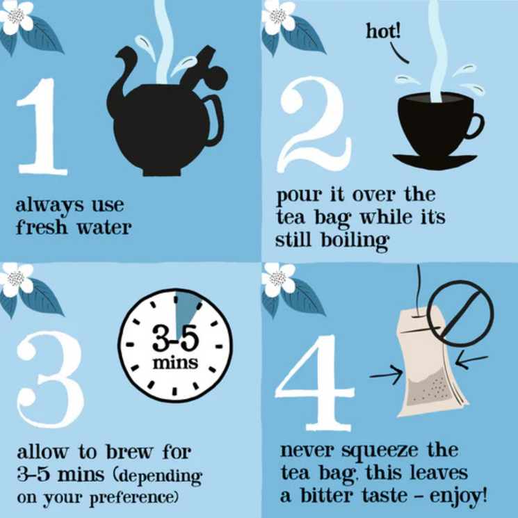 Use freshly boiled water and allow to infuse for 2–5 minutes.