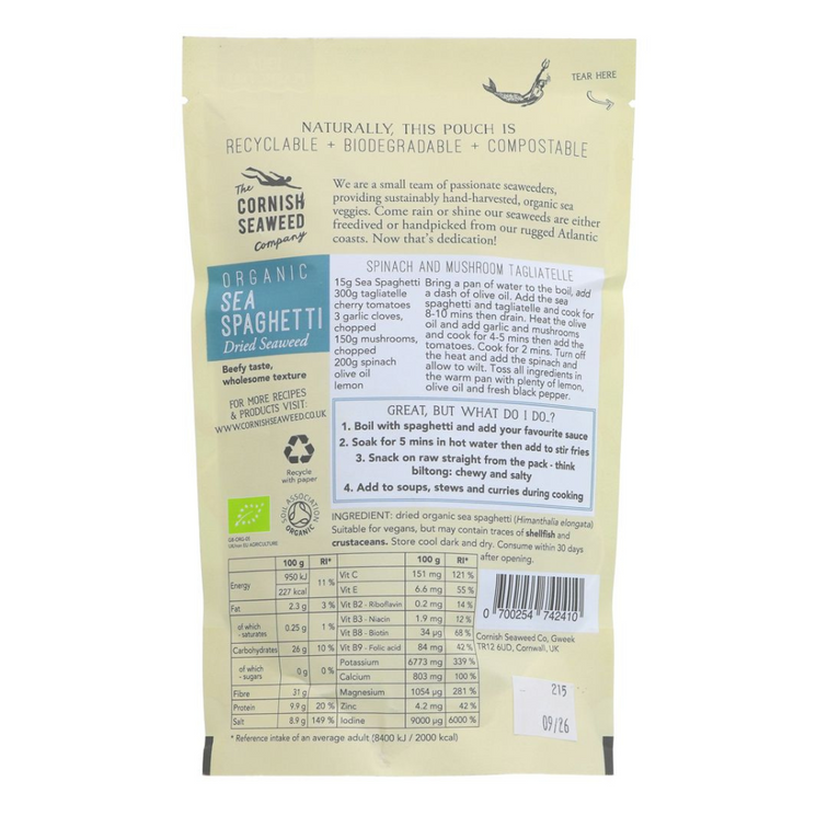Cornish Seaweed Organic Sea Spaghetti is a nutrient-dense sea vegetable harvested by hand from the clean waters of Cornwall. With its long, pasta like strands, sea spaghetti is a versatile ingredient that can be rehydrated and used in a wide range of dishes.