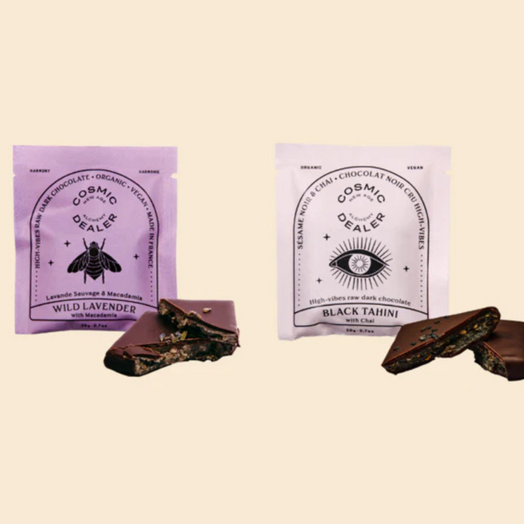 The Cosmic Dealer Nut Butter Chocolate Box is a delicious journey through seven artisan flavours. Each piece is crafted with a base of rich 75% dark chocolate and blended with creamy nut butters, fruits, and functional botanicals. From indulgent Peanut Butter & Smoked Salt to Pistachio & Lion’s Mane and Raspberry & Buckwheat, every bite is designed to surprise and delight.