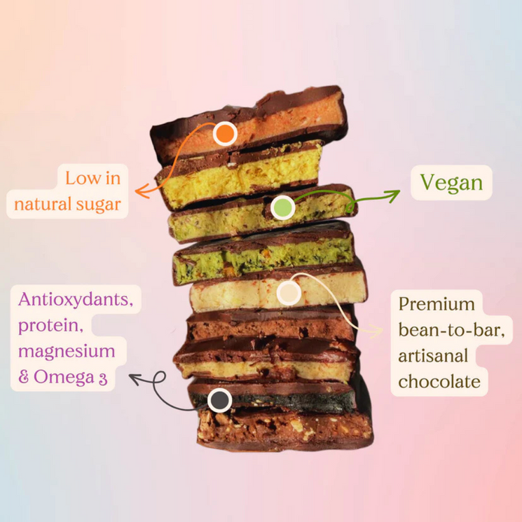 This chocolate box combines indulgence with function: creamy nut butters, antioxidant-rich dark chocolate, and superfoods like matcha, lion’s mane, and turmeric. It’s the ultimate blend of pleasure and wellness, crafted with care and sustainability.