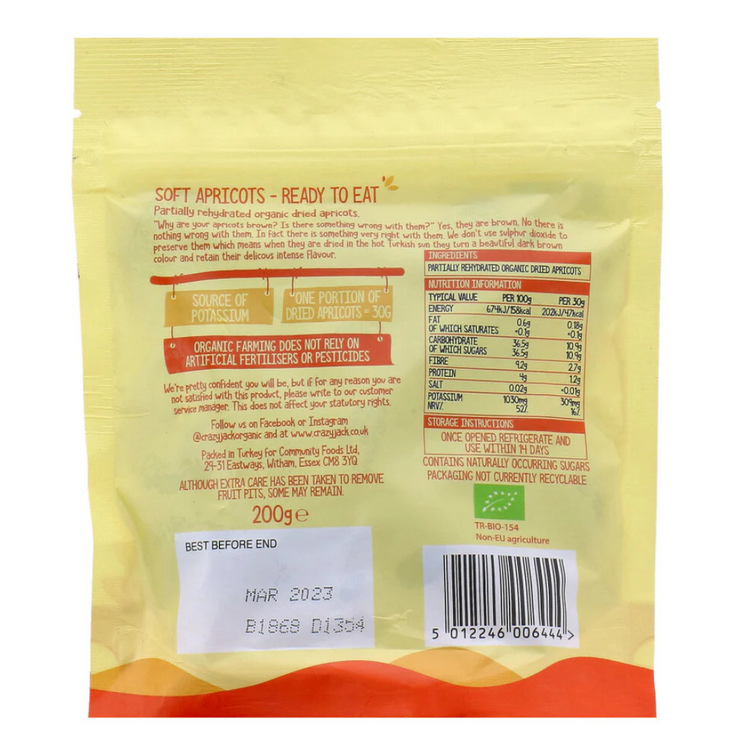 Crazy Jack’s Organic Soft Dried Apricots are naturally dark in colour, as they’ve been dried without the use of sulphites. Plump, chewy and rich in flavour, these apricots make a great on-the-go snack or a tasty addition to baking, salads and tagines.
