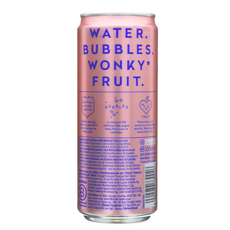 Dash Water Raspberry is a clean, refreshing alternative to sugary soft drinks using only sparkling spring water, real raspberry extract, and natural flavourings. Each can is infused with rescued wonky raspberries, giving you a lightly fruity fizz without any calories, sweeteners or sugar.