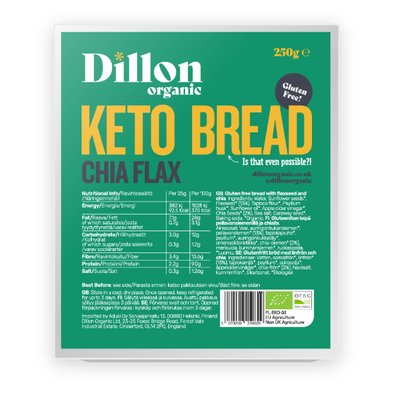 Dillon Organic Chia Flax Keto Bread is a deliciously dense and nourishing loaf crafted for those following a low-carb or ketogenic diet. Made with organic sunflower seeds, flaxseed, chia, and psyllium husk, this seed-based bread is naturally high in fibre and healthy fats without the gluten or refined flours.