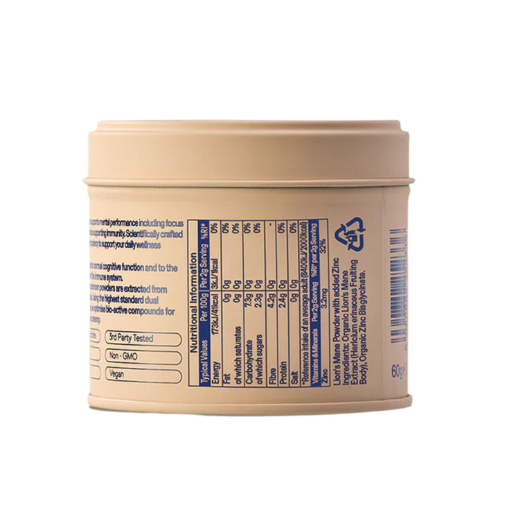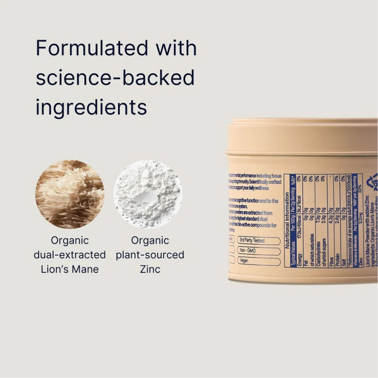 DIRTEA Organic Lion’s Mane Powder is a powerful natural supplement crafted to support cognitive clarity, memory, focus and energy. Made from 100% organic, dual-extracted fruiting bodies (not mycelium), each serving delivers 2,000mg of Lion’s Mane alongside a potent dose of organic zinc bisglycinate known to help protect immunity and assist with brain function.