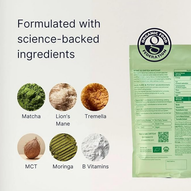 DIRTEA Mushroom Matcha Blend is a vibrant and uplifting fusion of ceremonial-grade matcha and functional mushrooms, designed to support focus, energy and inner calm. With 18% organic matcha and dual-extracted Lion’s Mane and Tremella (each at 21%), this blend brings together the best of cognitive support and natural beauty nourishment.