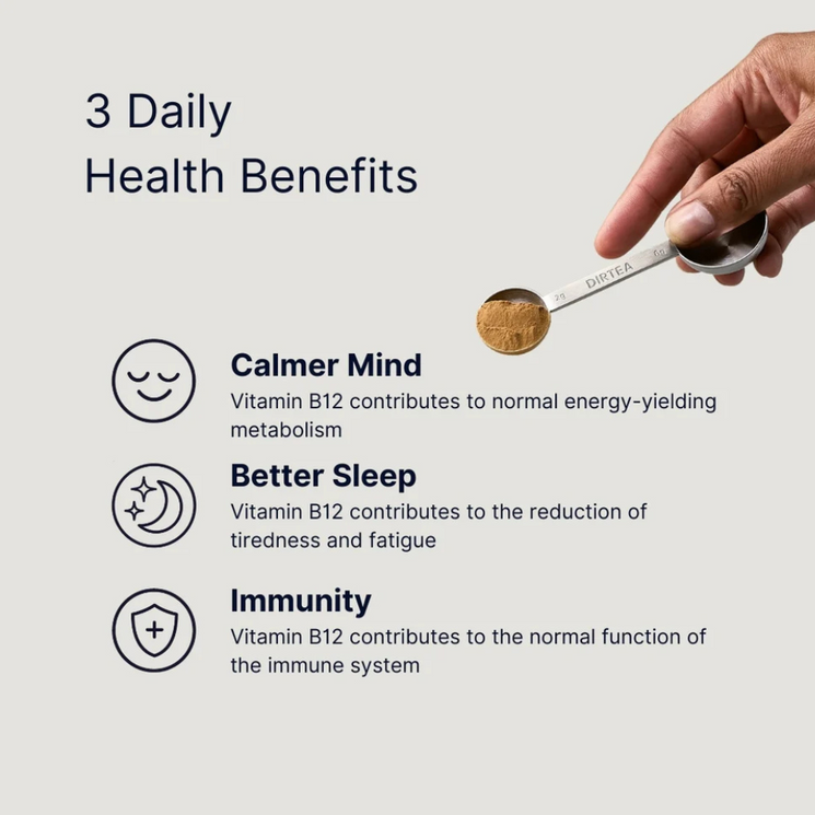 DIRTEA Organic Reishi Mushroom Powder is a deeply calming adaptogenic blend designed to support relaxation, nervous system balance and restorative sleep. Each 2g serving delivers 2,000mg of organic dual-extracted Ganoderma lingzhi alongside bioavailable B12 helping to reduce fatigue and promote a sense of inner calm.