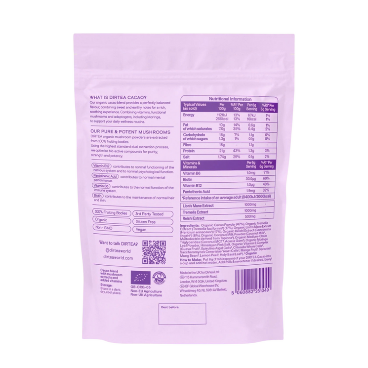 DIRTEA Superblend Adaptogen Organic Cacao combines ceremonial-grade organic cacao with a powerful blend of adaptogenic mushrooms and superfoods. With 47% cacao and therapeutic doses of organic Lion’s Mane, Reishi, Tremella, Moringa, and B vitamins, it’s a rich, functional drink designed to elevate focus, mood and energy without the crash.