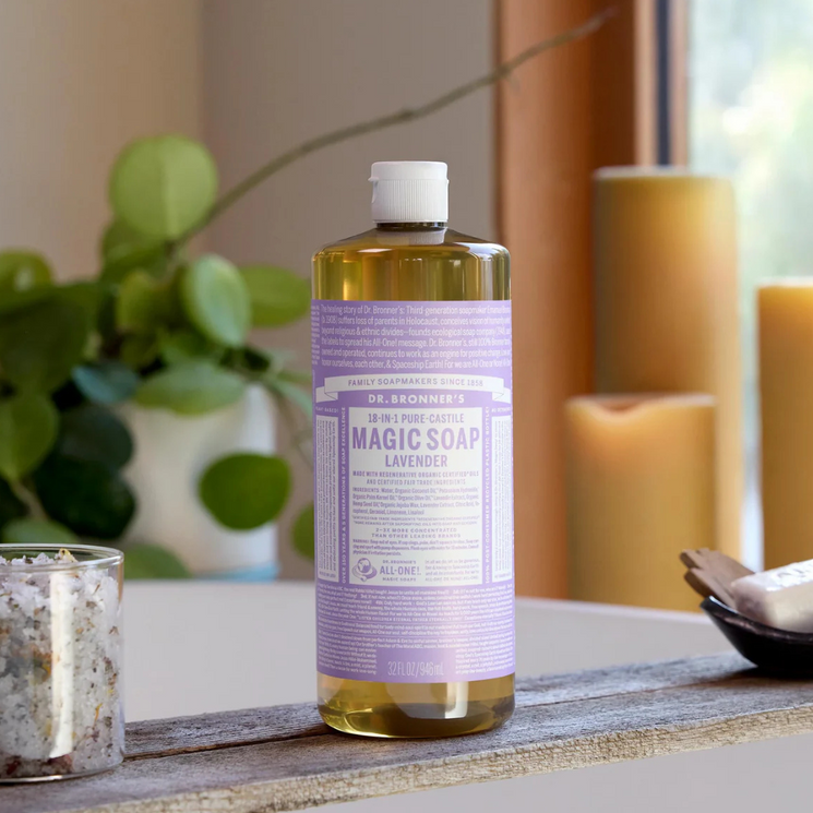 Dr. Bronner’s Lavender All-One Magic Soap is a calming multi-use cleanser made from organic plant oils and botanical extracts. Saponified coconut, olive, palm kernel, hemp and jojoba oils create a rich, gentle lather that’s ideal for face, body, hands, hair and even household cleaning.