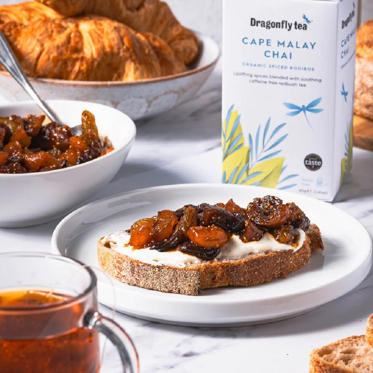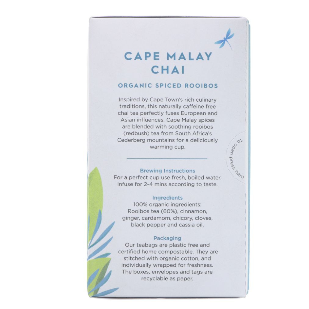 The Dragonfly Cape Malay Chai is a beautifully aromatic tea inspired by Cape Town’s diverse culinary traditions. Blending organically grown rooibos from the Cedarberg Mountains with warming cinnamon, ginger, and cardamom, this naturally caffeine-free infusion offers a rich and soothing taste experience.