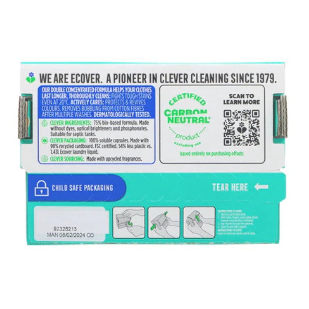 Ecover Laundry Capsules Bio are designed to make laundry day simple and effective. Each capsule contains the perfect dose of bio-enzyme cleaning power, tackling stubborn stains like food, grease, and mud while keeping colours bright and fabrics fresh.