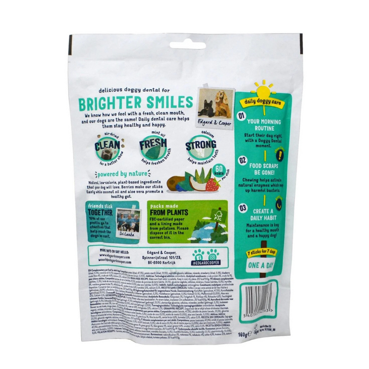 Edgard & Cooper Dog Dental Sticks Strawberry Mint are a delicious and functional way to help keep your dog’s teeth clean and healthy. With a chewy texture that encourages chewing, they naturally help reduce plaque and tartar build-up while freshening breath.
