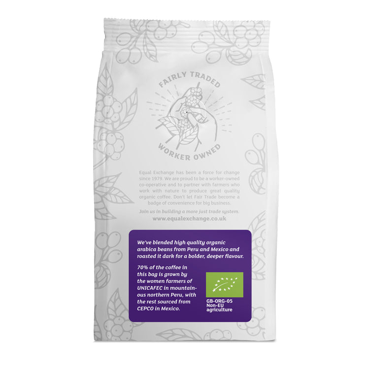 Equal Exchange Organic Dark Roast Ground Coffee is a rich, full-bodied blend created from premium organic Arabica beans grown in Peru and Mexico. 70% of the beans are produced by the women farmers of UNICAFEC in the mountainous north of Peru, with the remainder sourced from the dedicated growers of CEPCO in Mexico. Dark roasted for a deep, bold profile and velvety smooth finish, this coffee is perfect for those who enjoy a stronger cup without bitterness. Ideal for brewing in cafetieres, filters, or drip machines, it delivers a satisfying, premium coffee experience every time.