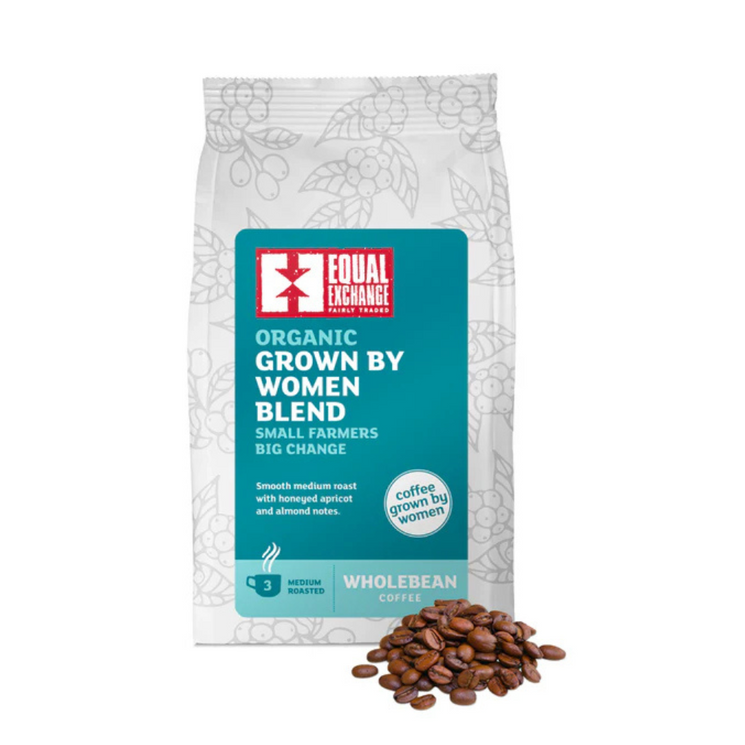 Equal Exchange Organic Women Farmers Coffee Beans combine high-quality Arabica beans from Nicaragua, Peru, and the D.R. Congo to create a unique, medium roast blend with rich honeyed apricot and almond flavours. This coffee is a tribute to the often-unrecognised women whose expertise, dedication, and skill are central to coffee production.