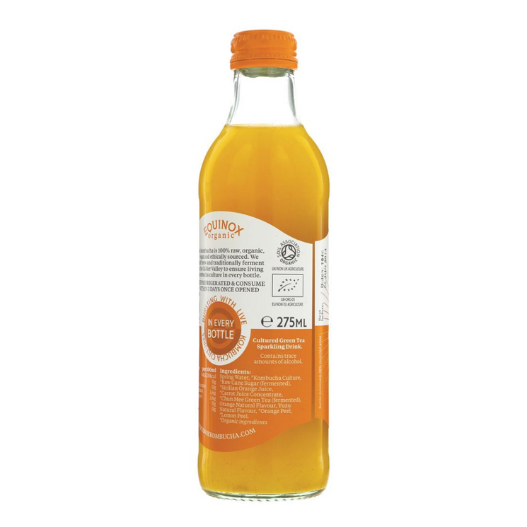 Filtered water, *kombucha culture, *raw cane sugar (fermented), *Sicilian orange juice, *carrot juice concentrate, *Chun-Mee green tea (fermented), orange natural flavour, yuzu natural flavour, *orange peel, *lemon peel.
