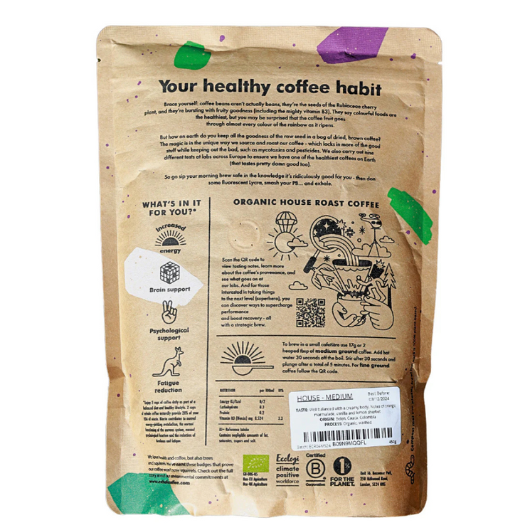 This premium medium-ground coffee is crafted from single-origin Arabica beans, grown organically for a clean, rich flavour. Roasted to lock in coffee’s naturally healthy compounds while keeping out unwanted nasties, it’s smooth, balanced, and bursting with aroma. Suitable for a range of brewing methods, it delivers café-quality coffee at home, any time of day.