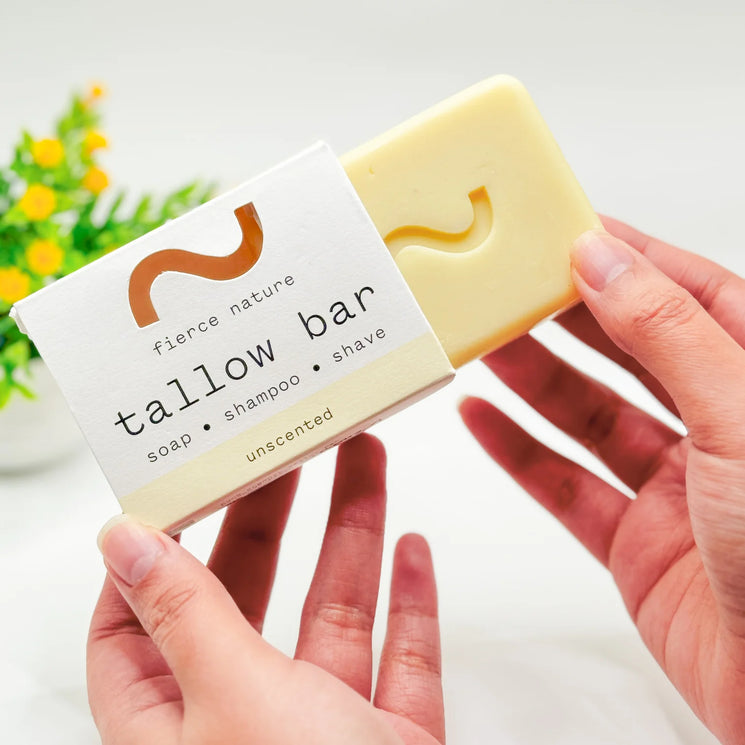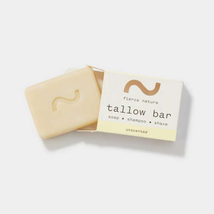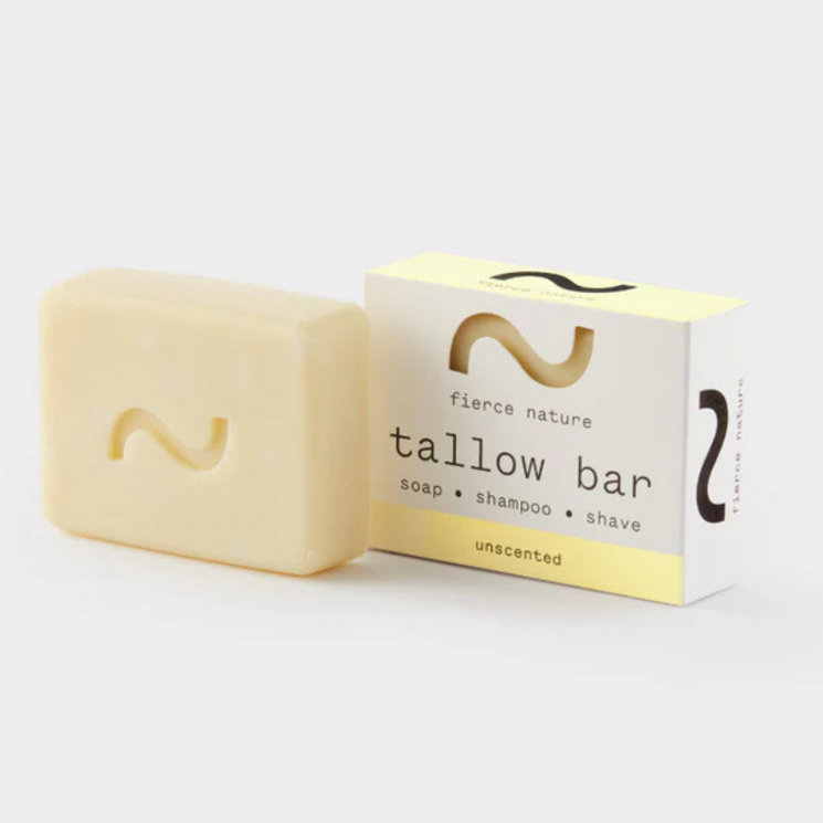 The Fierce Nature New Multi-Use Tallow Bar is your versatile, natural essential for face, body, and hair care. Its improved formula blends organic tallow, olive oil, coconut oil, and castor oil to provide a gentle but thorough cleanse while deeply nourishing the skin and hair.