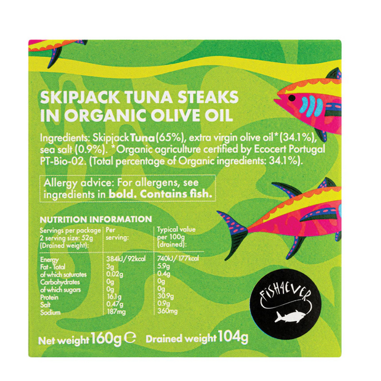 Fish 4 Ever Azores Skipjack Tuna Steaks are responsibly line-caught in the pristine waters of the Azores, protecting marine life and supporting sustainable fishing communities. Packed in rich organic extra virgin olive oil with just a touch of salt, these tuna steaks are naturally nutritious and full of flavour.