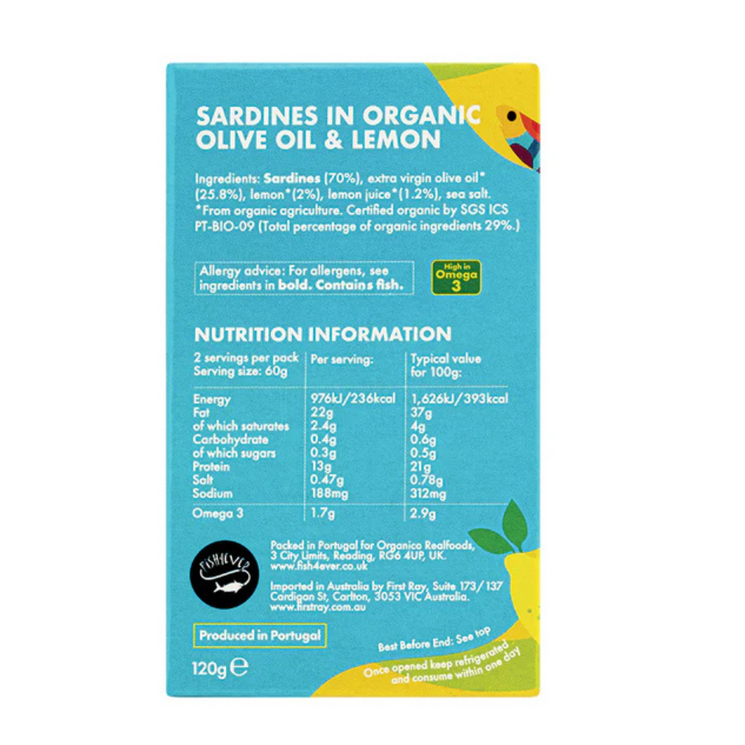 Fish 4 Ever Wild Caught Whole Sardines in Organic Olive Oil & Lemon are a clean and wholesome choice for everyday nutrition. Responsibly fished and packed in organic extra virgin olive oil with a touch of lemon, they balance vibrant flavour with rich natural goodness.