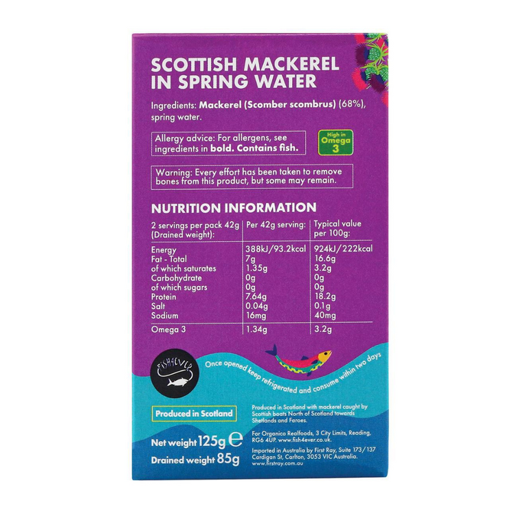 Fish 4 Ever Wild Caught Mackerel in Spring Water offers clean, simple nutrition with nothing but mackerel and pure spring water. Carefully prepared to preserve the natural taste and texture of the fish, it’s a nutrient-rich source of protein and omega-3 fatty acids to support heart, brain, and overall health.
