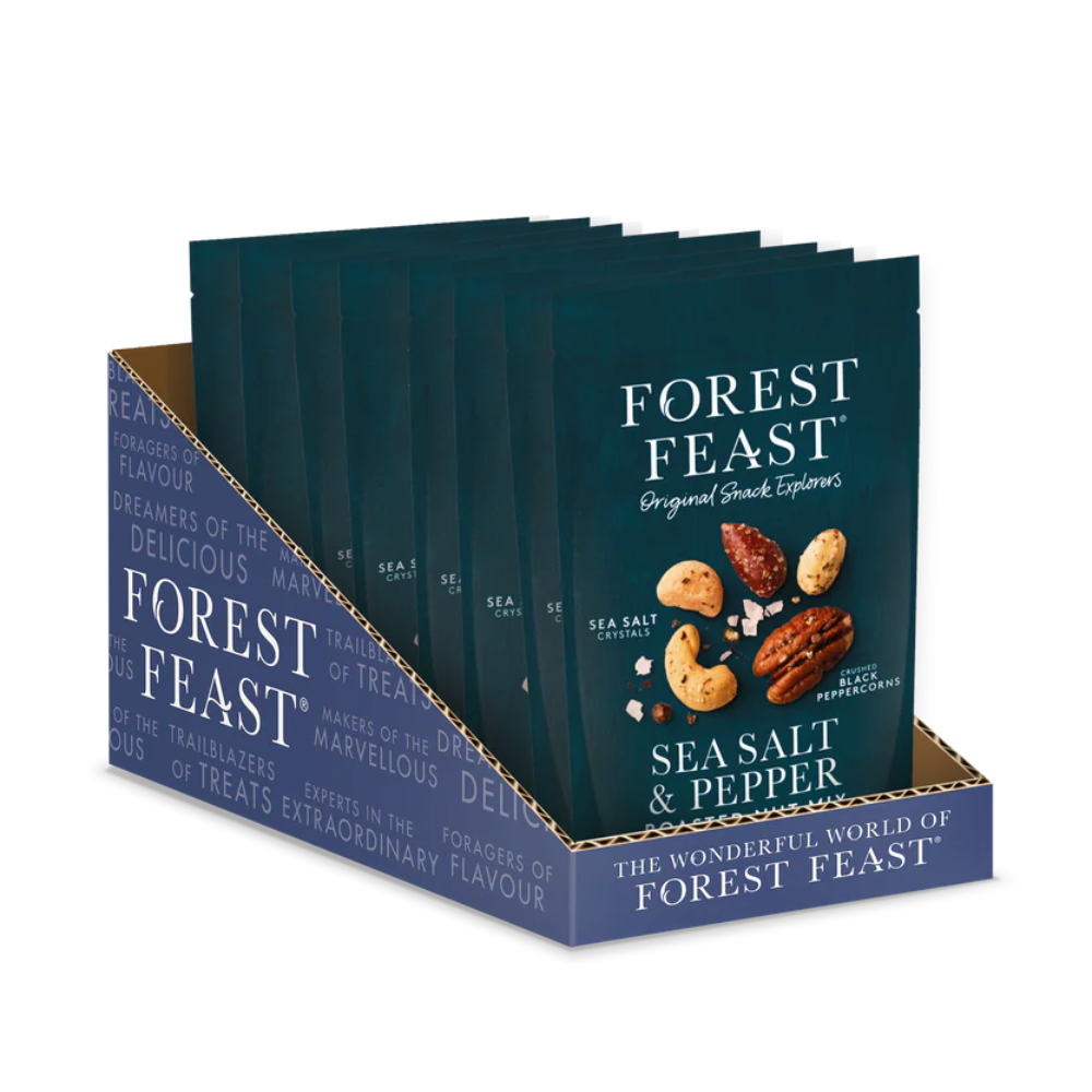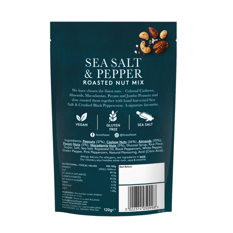 Forest Feast Sea Salt & Black Peppercorn Roasted Nut Mix is a bold and savoury snack, bringing together roasted nuts and a punchy seasoning blend of sea salt and four peppercorns. Perfect for sharing, snacking on the go, or pairing with your favourite drink.
