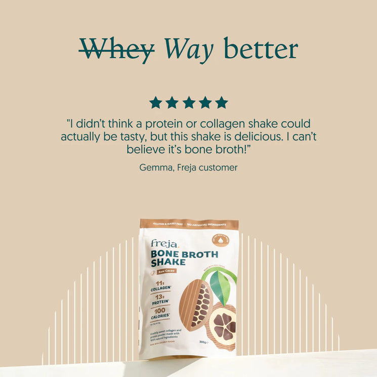 Freja Bone Broth Shake Cacao blends Nordic beef bone broth powder with cocoa and natural flavouring to create a delicious, protein-packed drink. With 13g of protein and 11.5g of collagen per serving, it’s a great way to support your daily wellness routine. Perfect as a post-workout shake or as a nourishing, chocolatey boost anytime of day.