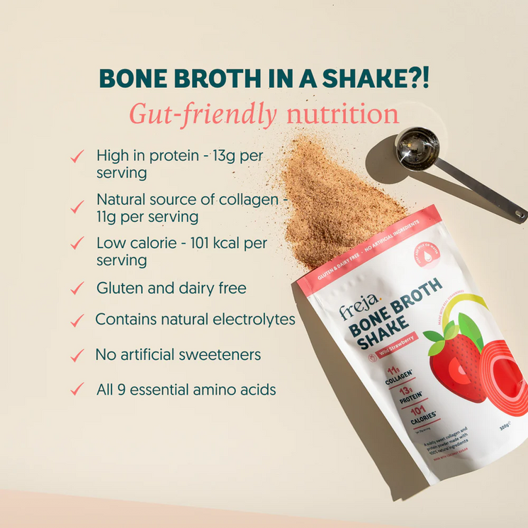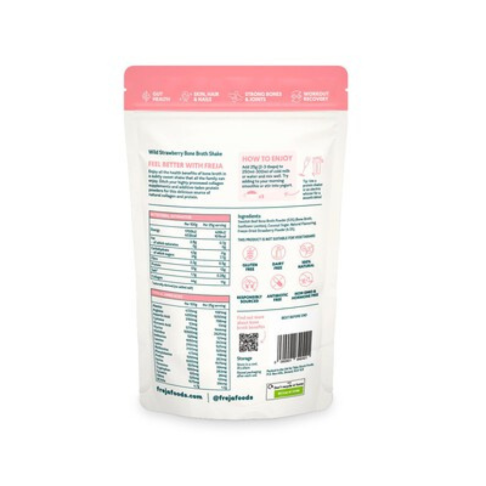 Freja Bone Broth Shake Strawberry combines premium Nordic beef bone broth powder with freeze dried strawberry for a naturally sweet, fruity protein boost. Each serving delivers 14g of protein and 12g of collagen to support strength, recovery and wellness. A light and refreshing shake that’s as nourishing as it is delicious.
