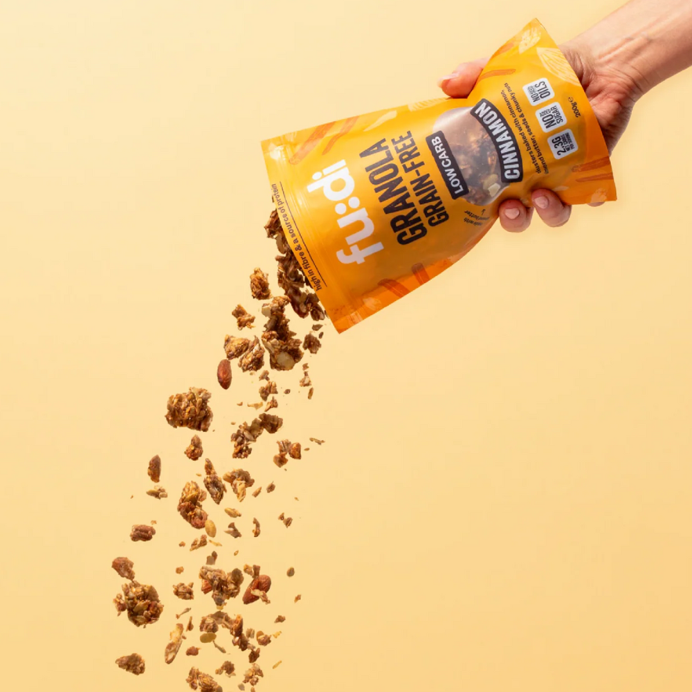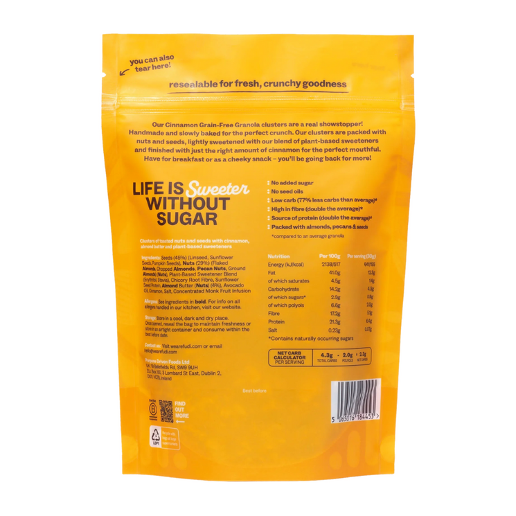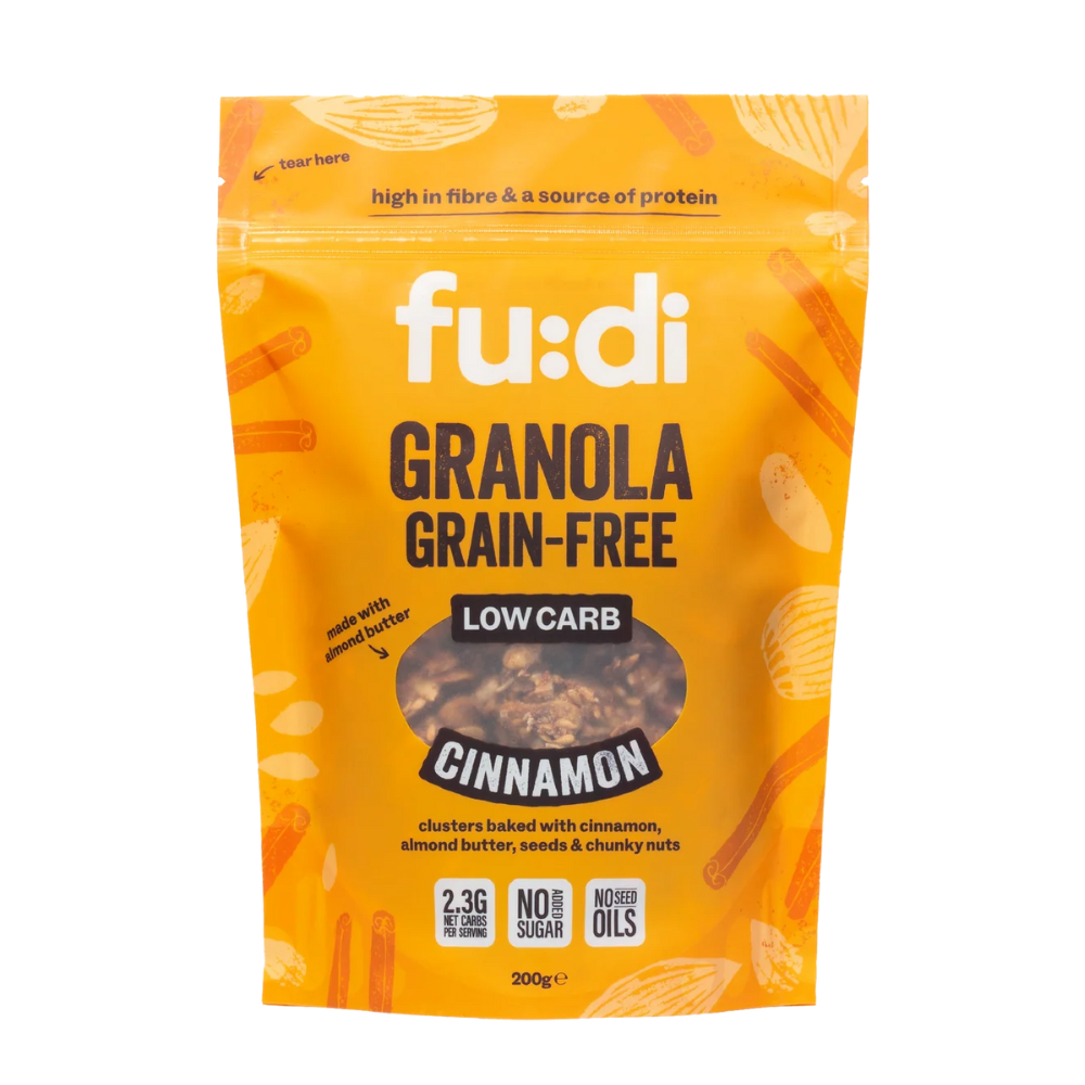 Fudi Granola Cinnamon is a wholesome blend of seeds, nuts, almond butter, and warming cinnamon, baked to crunchy perfection. Naturally sweetened with erythritol, stevia, and monk fruit, this low carb granola is rich in protein and fibre while keeping sugars to a minimum.