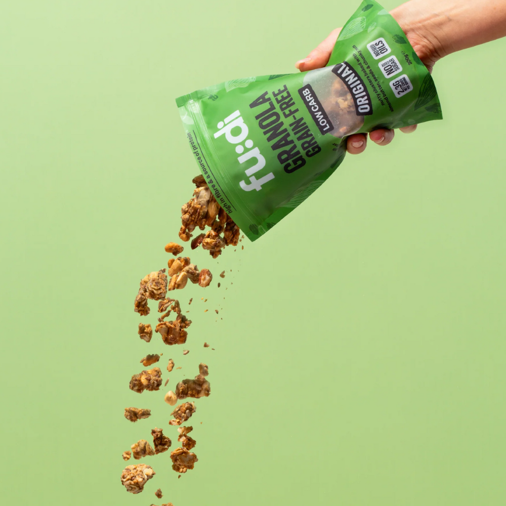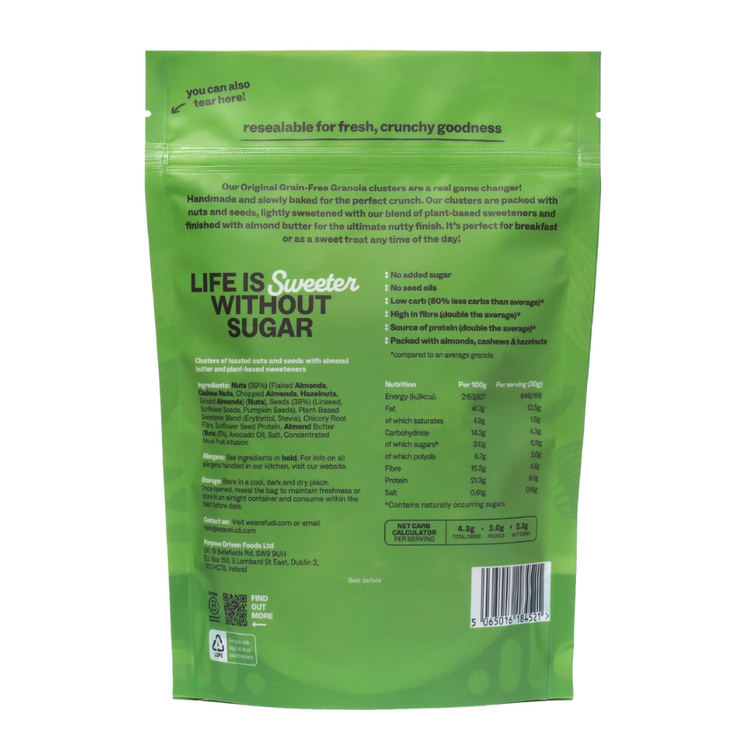 Fudi Granola Original is a nourishing blend of nuts, seeds, and natural plant-based sweeteners, crafted to fuel your mornings without unnecessary carbs or sugars. With 39% nuts and 38% seeds, this crunchy granola is rich in healthy fats, plant protein, and fibre, making it an ideal choice for keto, low carb, or balanced lifestyles.